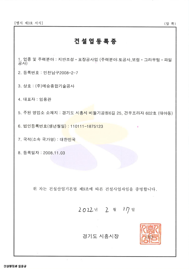 주식회사 예승종합기술공사 | 대표자 : 임용관 | 사업자등록번호 : 215-81-86759